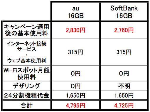 上の比較表を見ると、SoftBankの月額料金が70円安いだけで両キャリアの支払額には大して差がないということが分かる。この70円の差は、auのスマホセット割とSoftBankのスマホまとめて割の割引額の違いでした。また、SoftBankのデザリングの料金はまだ不明であった。