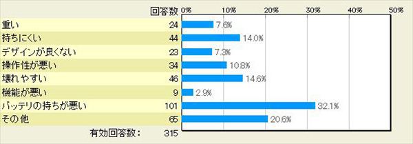 「機能が悪い」(9人、2.9%)と回答した人には、具体的にどの機能が悪かったと思うか聞いてみた。多かったのは、「おサイフケータイ」や「ワンセグ/フルセグ」といった、最新のAndroidスマートフォンに搭載されている機能が欲しいという意見。新型iPhoneでは、NFCやおサイフケータイが搭載されるという噂もあるが、シンプルさが売りのiPhoneにとっては少々酷な結果かもしれない。